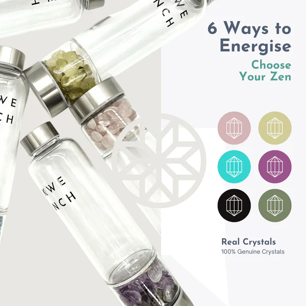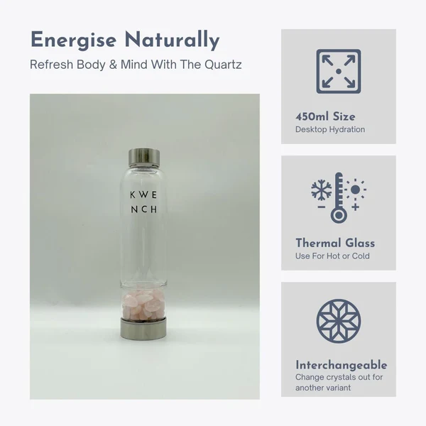 Our stunning Quartz range is designed for those of you who demand the best for your body, mind and soul. A beautiful product in every way – stunning packaging, quality glass bottle, and genuine crystals. Kwench your Thirst in style, with intention and positive energy.